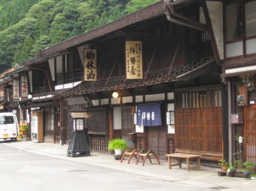今も、狭い道の両側には、長い軒先を突き出した出桁造りで、くぐり戸などのある家が残り、馬籠宿にかわらぬ風情の残る宿なので我々も宿泊する計画をたてていた。上の写真は我々が宿泊した伊勢屋だが、越後屋等の旅館とともに江戸時代そのままの景観をつくりだしている。