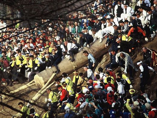 樹齢200年程の樅の木を 山奥から切り出し、ロープをつけて多数の人達で引っ張り、傾斜地は「引き落とし」をしながら神社まで運ぶのである。堤防から川に引き落としそれを引き揚げるのはまさに爽快・痛快であった。(怪我人は勿論、時には死者も出ることもあるらしい。)