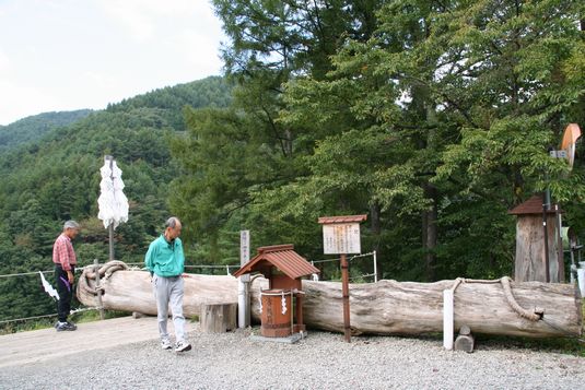 目的の神社に到着すると、各神社の四隅に立てる。上の写真の右端に立っている木が前回建てた御柱である。