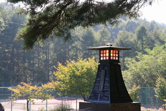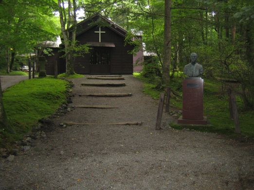 教会の前に軽井沢開発の恩人、英国人宣教師アレキサンダー・ショーの記念碑がある。