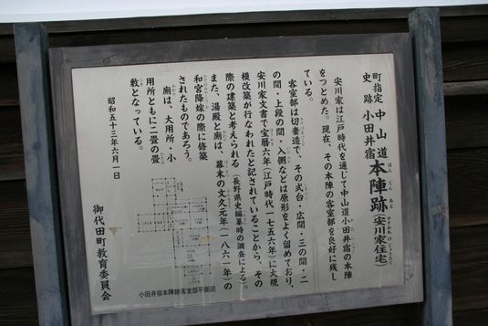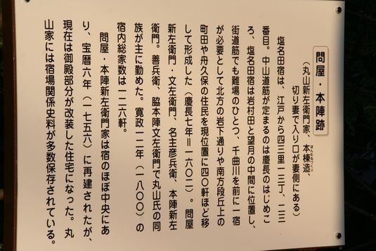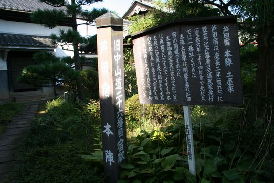 屋根門を持った本陣跡の石合家。この家の家屋は中山道中の最古のものだといわれている。現在居住していて中を見学できなかった。 詳細は下記の標識を。