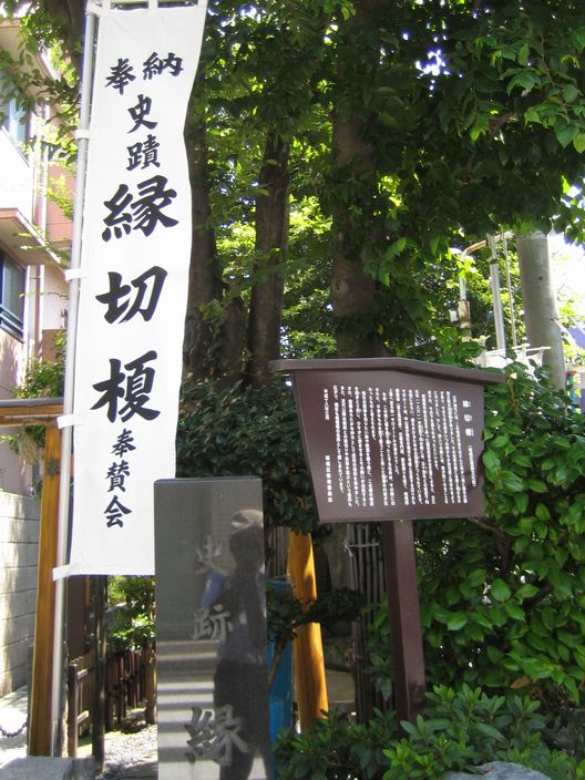 小さな祠も見られ、奉納された幟がたくさん風にはためいている。江戸時代、この辺りには樹齢数百年の立派な榎が生い茂り、枝が道を覆うように張っていた。いつの頃からか嫁入りや婿入りの行列がこの下を通ると、不縁になると恐れられ、この木を誰言うことなく「縁切り榎」と呼んだ。