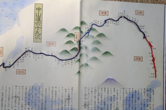 山城の国の三条大橋から近江・美濃・木曽・信濃・上野(こうずけ)を経て武蔵の国の日本橋まで、百三十五里三十二丁(約533.9km)、中山道69宿。東海道よりも約40km長い道程を夜行列車・バスで行った日等も入れ、約30日の日数をかけてやっと辿り着いた。