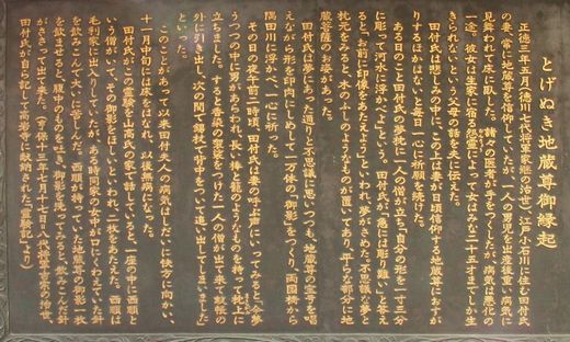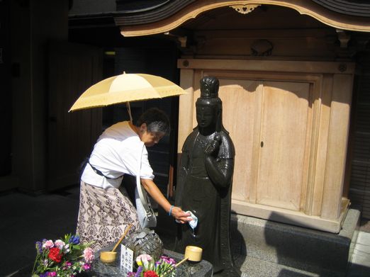 この寺は、1891年に下谷から移って来たので古くはないが線香の煙が絶えないほど信者が多い。巣鴨地蔵通りの名も、この地蔵さんからきているらしい。本尊の御影の護符を身体の痛む部分に貼るか、水に溶かして飲むと、痛みがトゲを抜くように引くと言われている。丁度熱心な信者さんが痛みを直していただいたお礼にお参りし、地蔵さんの身を清めていた。