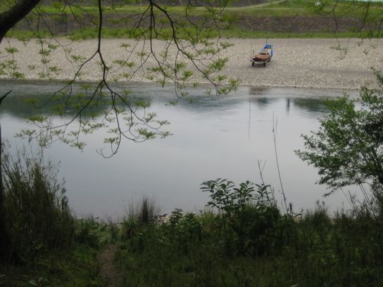 南岸の対岸の「安居の渡し場跡」から 北側の対岸の「安居の渡し場跡」を見ると予約をしておくと乗せてもらえる渡し船が見える。