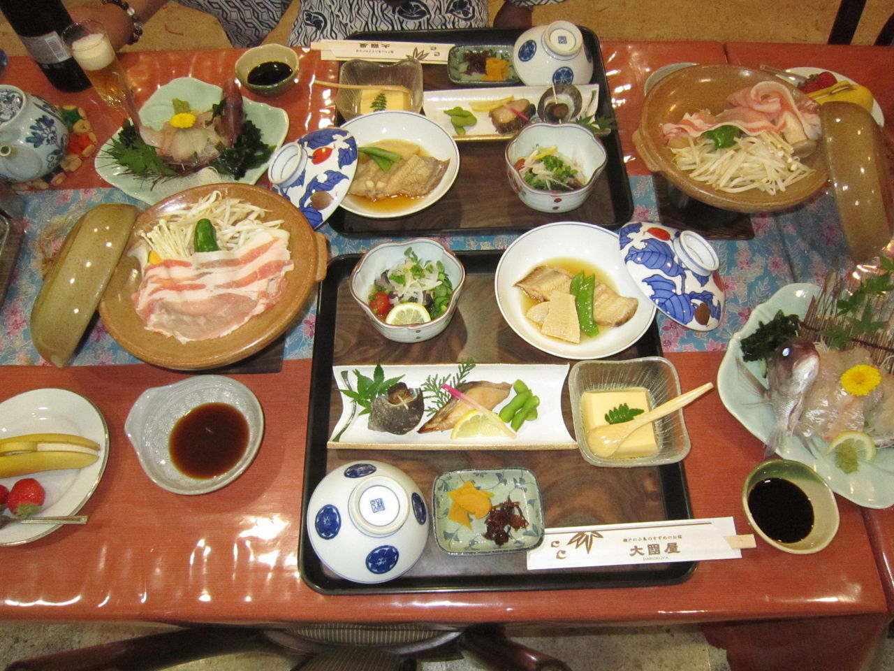 豪華な夕食(二人分が写っている 手前と奥 )を般若湯とともに頂く。