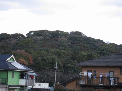 こじんまりとした駒ヶ谷小学校を過ぎてしばらくすると前方のブドウ畑の向こうに二上山が見えて来た。
